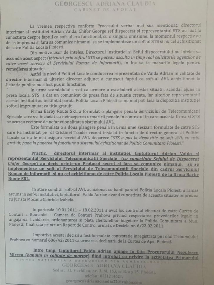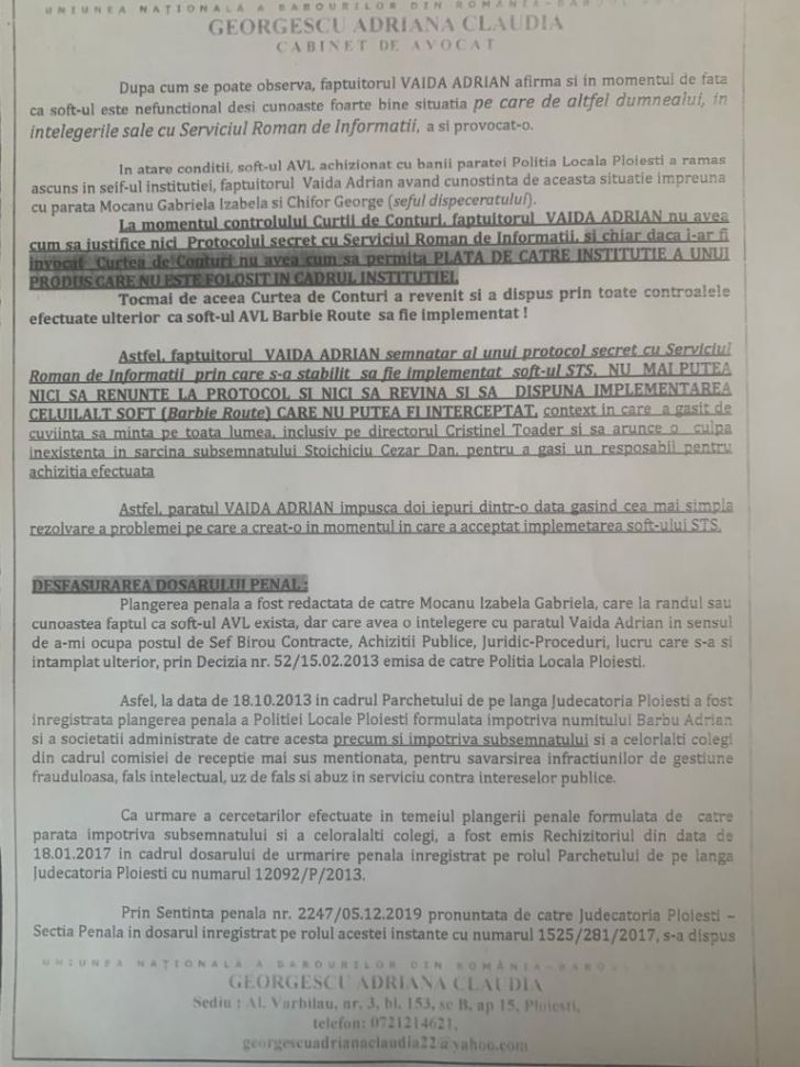 Plângerea a fost făcută de fostul director general TOADER în numele instituției pe care o conducea, conținea datele și informațiile pe care i le prezentasera trunchiat și inexact foștii directori generali, VAIDA ADRIAN și TĂNASE DANIEL, precum și multe omisiuni cu rea credință pentru ascunderea adevărului și în dorința de a prezenta variante false ale situației de fapt, de către cei doi funcționari publici foști în funcții de conducere la nivelul Poliției Locale Ploieșți, privind încheierea și derularea contractului de achiziții publice a 120 terminale TETRA și a soft-ului AVL de la SC BARBY ROUTE SRL Brașov.