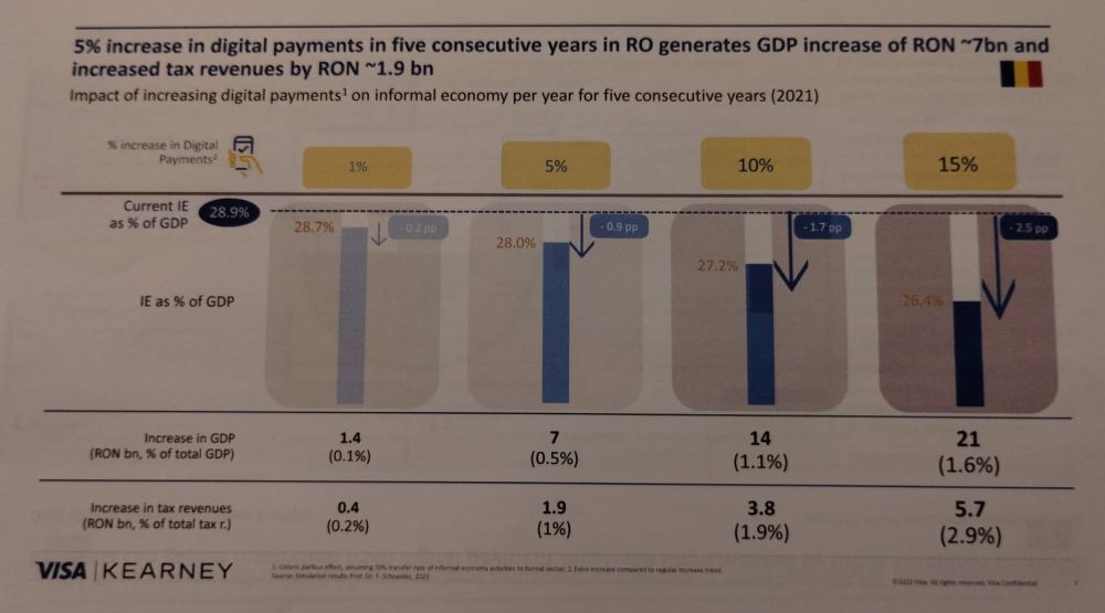 România pierde aproximativ 80 de miliarde de lei anual în colectarea taxelor prin economia subterană, caracterizată în special de munca nedeclarată, potrivit unui studiu realizat de Visa și compania de consultanță Kearney. „O creștere de 5% în plățile digitale timp de cinci ani consecutivi ar aduce o creștere a PIB-ului de aproximativ 7 miliarde de lei și o creștere a colectării de taxe cu aproximativ 1,9 miliarde de lei”, arată studiul.