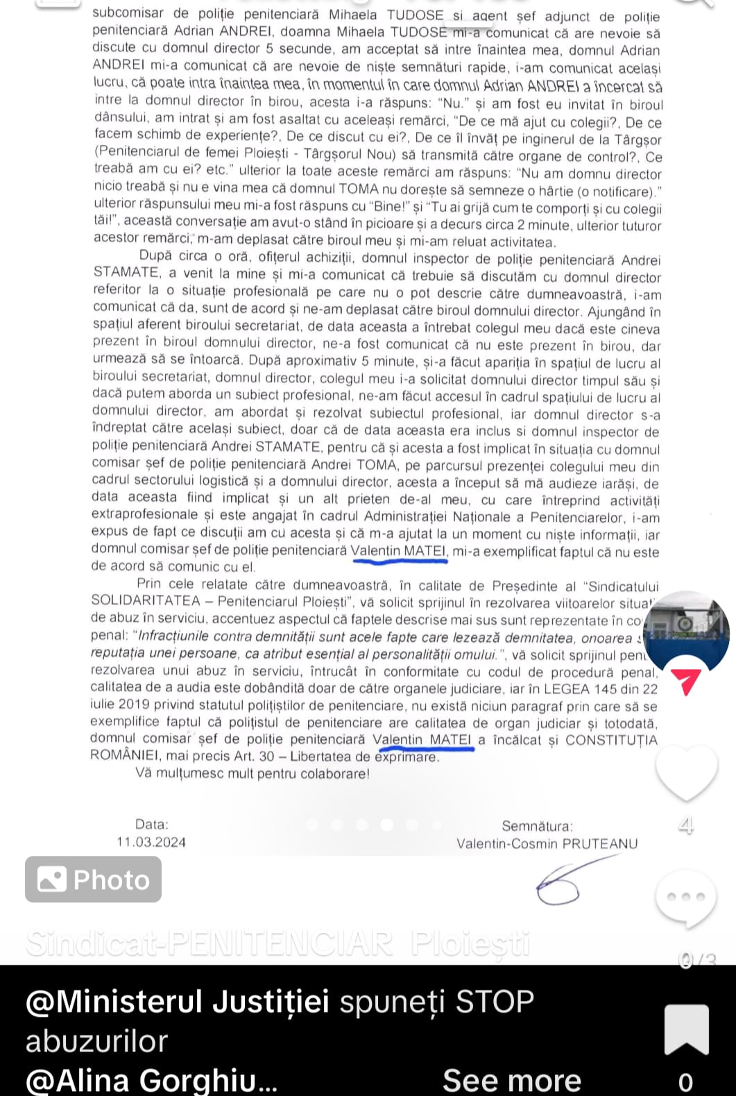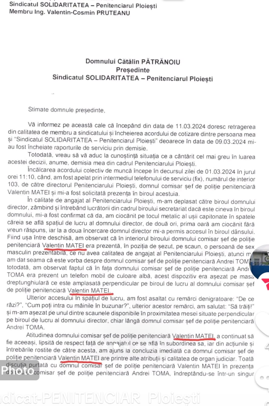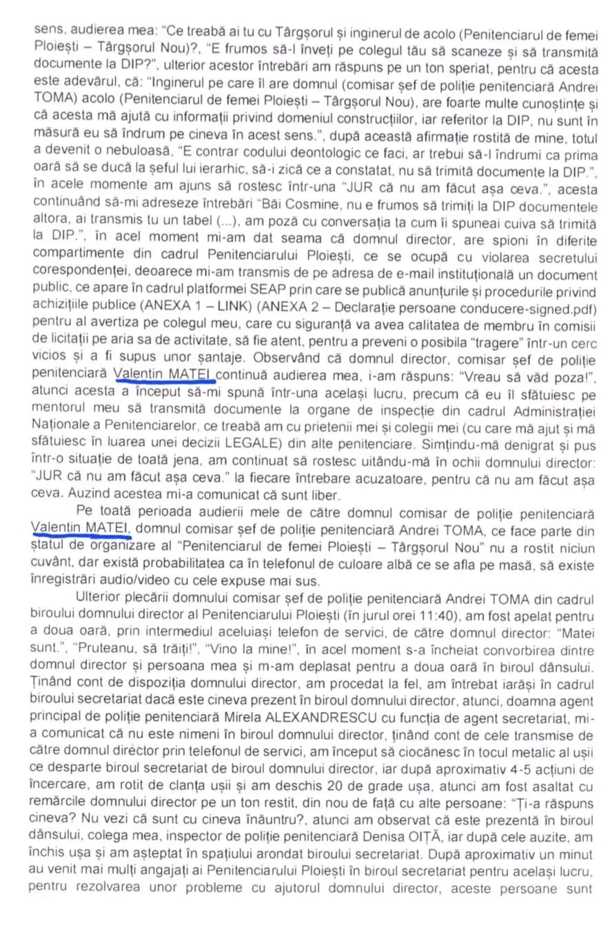 Toata discutia purtata cu domnul comisar sef de politie penitenciara Valentin Matei, in prezenta domnului comisar sef de politie penitenciara Andrei Toma, indreptandu-se intr-un singur sens, audierea mea,” Ce treaba ai tu cu Targsorul si inginerul de acolo (Penitenciarul de Femei Ploiesti Targsorul Nou). E frumos sa-l inveti pe colegul tau sa scaneze si sa transmita documente la DIP? … jur ca nu am facut asa ceva , acesta continuand sa-mi adreseze intrebari “ Bai Cosmine , nu este frumos sa trimiti la DIP documentele altora, ai transmis tu un tabel(…), am poza cu conversatia ta cum ii spuneai cuiva sa trimita la DIP.”