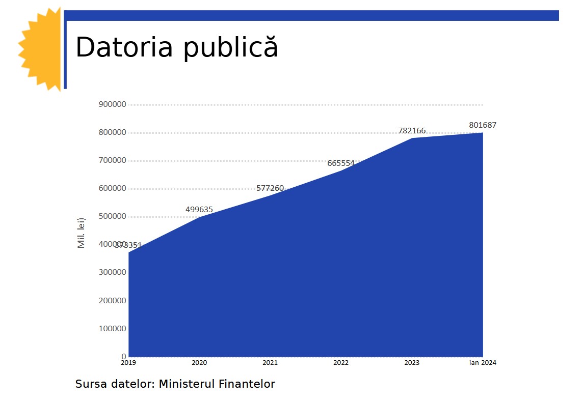 Datoria publică a ajuns în ianuarie 2024 la 50,2% din PIB, adică 801,6 miliarde lei, conform datelor Ministerului Finanțelor. Din această sumă, cea mai mare parte este pe termen mediu și lung 759,9 miliarde lei.