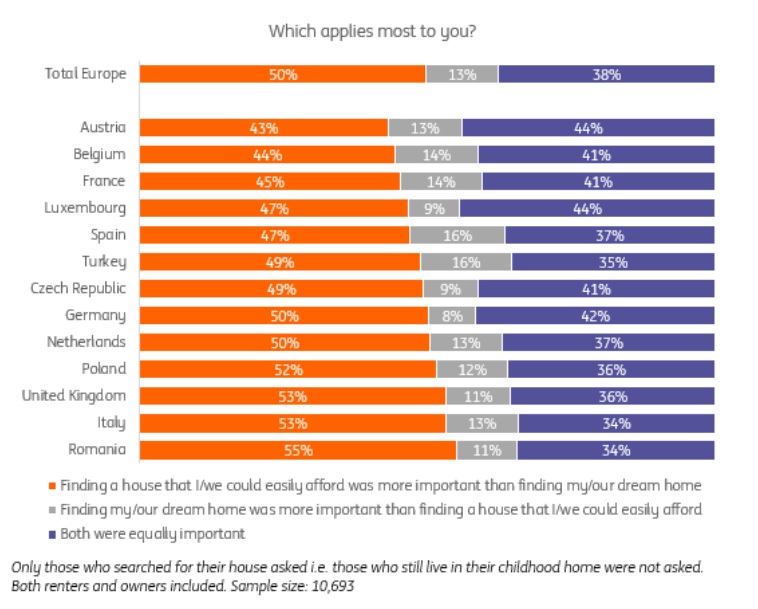 Doi din cinci (41%) europeni dintr-un sondaj ING au spus că au petrecut mai puțin de trei luni căutând proprietatea pe care o dețin în prezent, 15% spunând că au petrecut mai puțin de o lună. În general, aproape 90% dintre respondenți au făcut totul în cel mult un an.