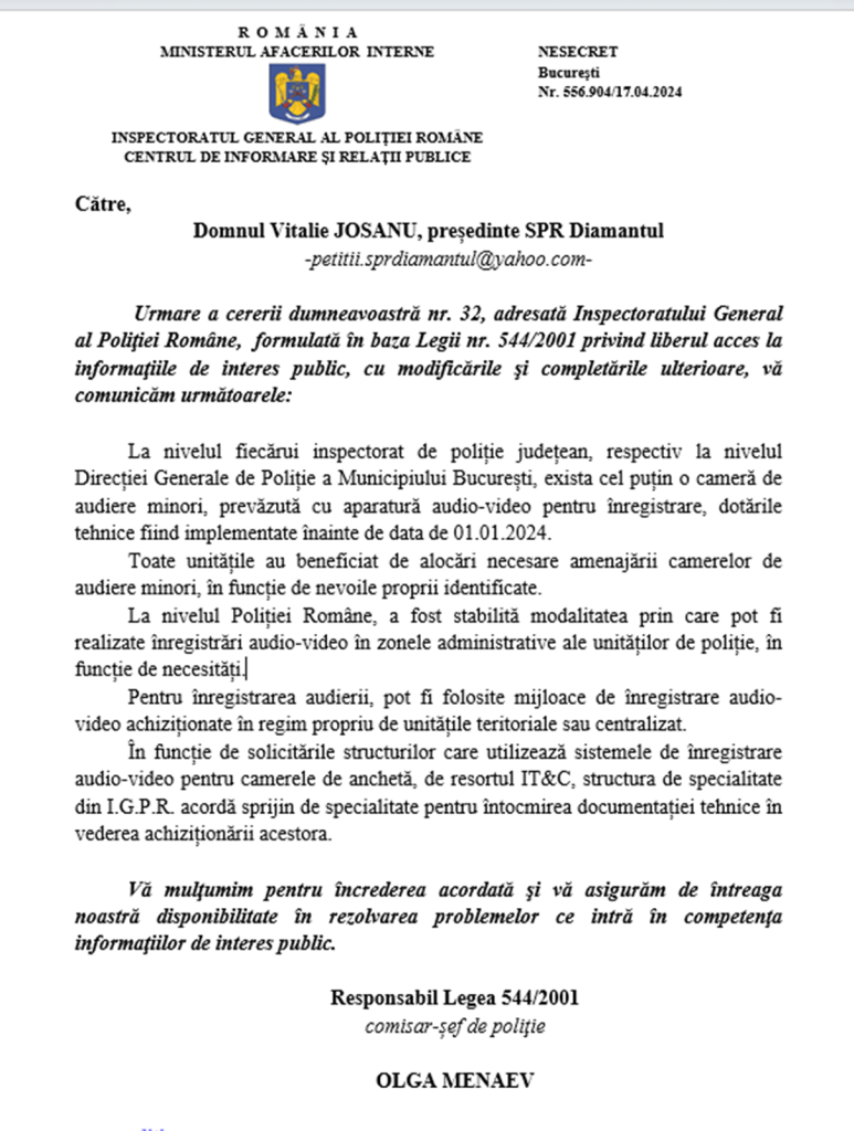 În mod vădit, aceste formulări evazive, arată că Poliția Română era total nepregătită la data de 01.03.2024 în ceea ce privește funcționalizarea camerelor de audiere. Să afirmi că ai cel puțin o cameră de audiere/județ, asta înseamnă să nu ai habar de volumul cercetărilor într-un județ. A… și să revenim la minori, cred că nu avem vreun naiv să găsească în acest răspuns și oarecare atenție acordată minorilor.