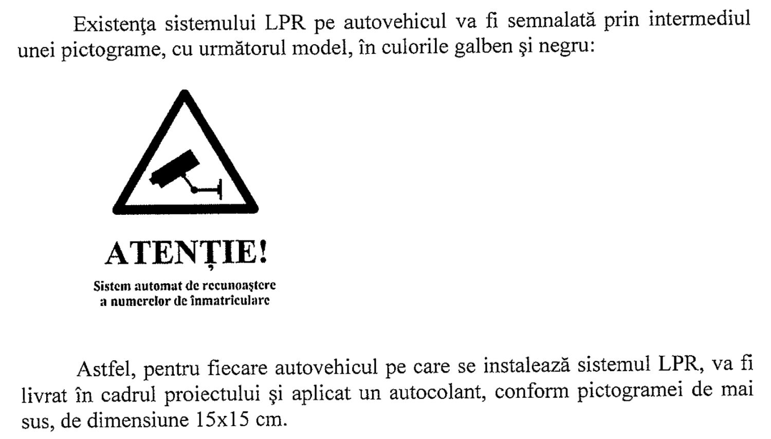 Pentru fiecare autovehicul pe care se instalează sistemul LPR, va fi livrat în cadrul proiectului şi aplicat un autocolant, conform pictogramei de mai sus, de dimensiune 15×15 cm.