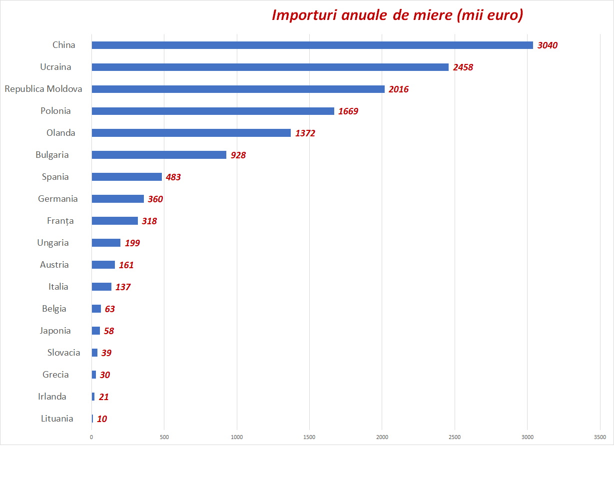 Importurile de miere din ţările situate în afara blocului comunitar au venit anul trecut în special din China (60.200 tone sau 37% din total), Ucraina (45.800 tone, 28%), Argentina (20.400 tone, 12%), Mexic (10.700 tone, 7%) şi Cuba (4.700 tone, 3%).