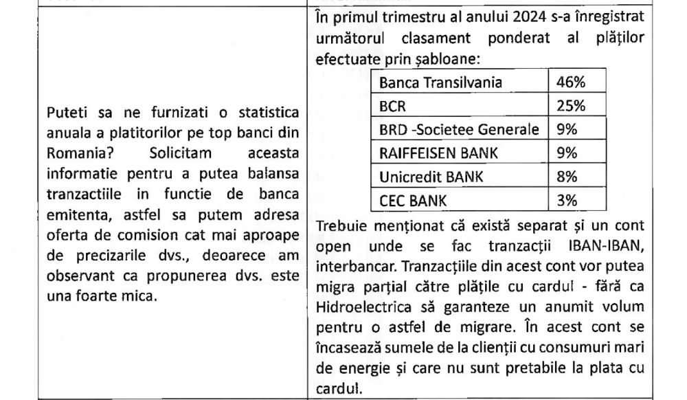 În cadrul licitației, un posibil ofertant a întrebat Hidroelectrica dacă poate furniza o statistică anuală a plătitorilor pe top bănci, iar datele comunicate de companie arată că în primele trei luni din acest an cele mai multe plăți au fost făcute de clienți ai Băncii Transilvania (46%), BCR (25%), BRD (9%), Raiffeisen (9%), Unicredit (8%) și CEC Bank (3%).