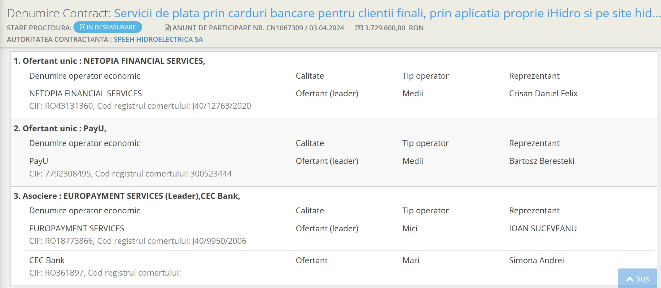 Pentru a rezolva această problemă, Hidroelectrica a lansat la începutul lunii aprilie o licitație deschisă, la care a primit trei oferte din partea: Netopia Financial Services, PayU și respectiv Europayment Services (în asociere cu CEC Bank).