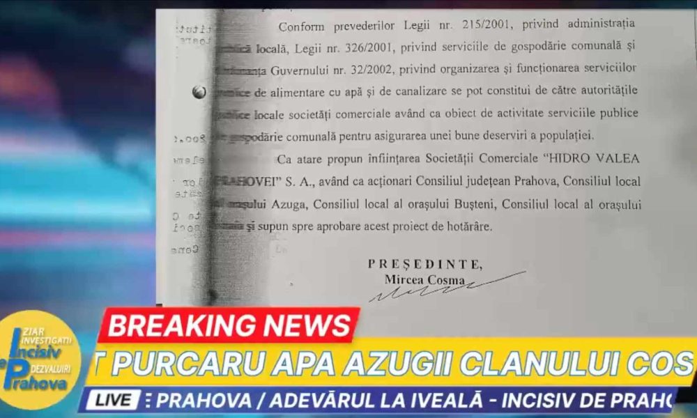 În primul deceniu al anilor 2000, printr-o serie de hotărâri și procese-verbale, primarul în exercițiu la acea vreme a cedat, treptat, către Consiliul Județean condus de clanul Cosma, apoi către o societate comercială nou înființată, sistemul de captare-tratare- pompare și distribuție a apei, în Azuga și orașele din aval – Bușteni, Sinaia.