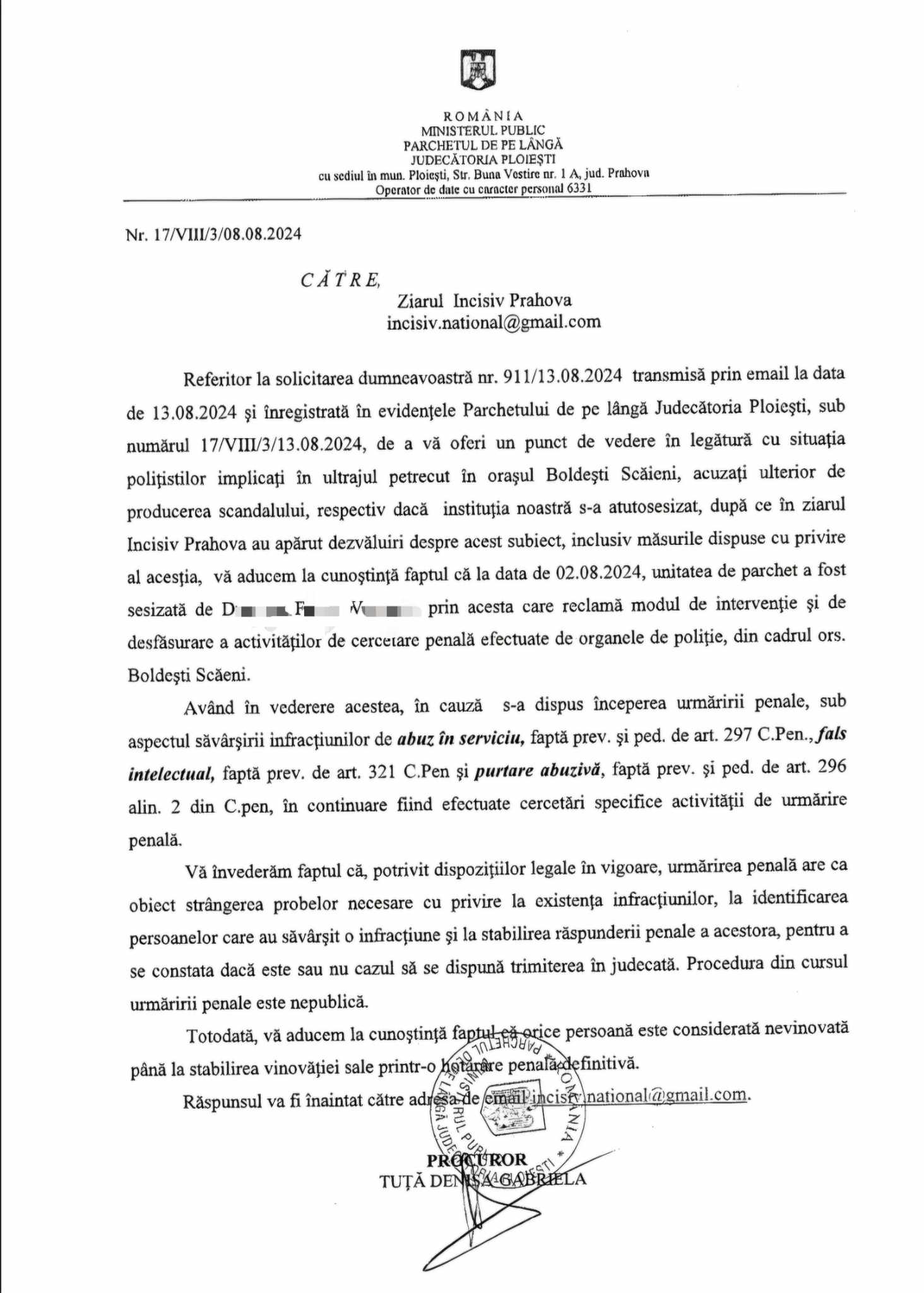 Ziarul „Incisiv de Prahova” a adunat dovezi solide, inclusiv înregistrări din body-cam-uri, care contrazic declarațiile falsificate ale agenților de poliție. Aceste informații ridică îngrijorări serioase într-o societate democratică, privind integritatea și responsabilitatea forțelor de ordine (aici), (aici), (aici), (aici) si (aici)