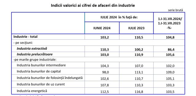 Comparativ cu luna iunie 2024, în iulie cifra de afaceri din industrie a crescut în termeni nominali, cu 3,2%, datorită creşterii înregistrate în industria extractivă cu 10,3% şi în industria prelucrătoare cu 3%.
