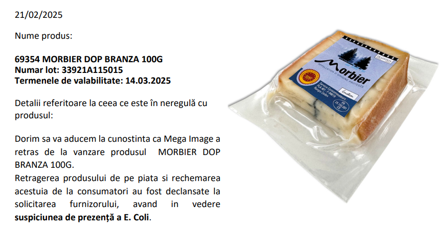 „Dorim să vă aducem la cunoștință că Mega Image a retras de la vânzare produsul MORBIER DOP BRÂNZĂ 100G.