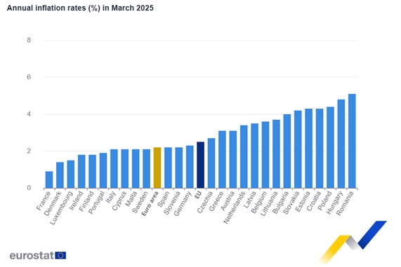 Rata anuală a inflației în Uniunea Europeană a continuat să scadă în luna martie, până la 2,5%, de la un nivel de 2,7% în februarie, însă România a redevenit țara cu cea mai ridicată inflație, cu un avans anual al prețurilor de 5,1%, arată datele publicate, miercuri, de Eurostat.
