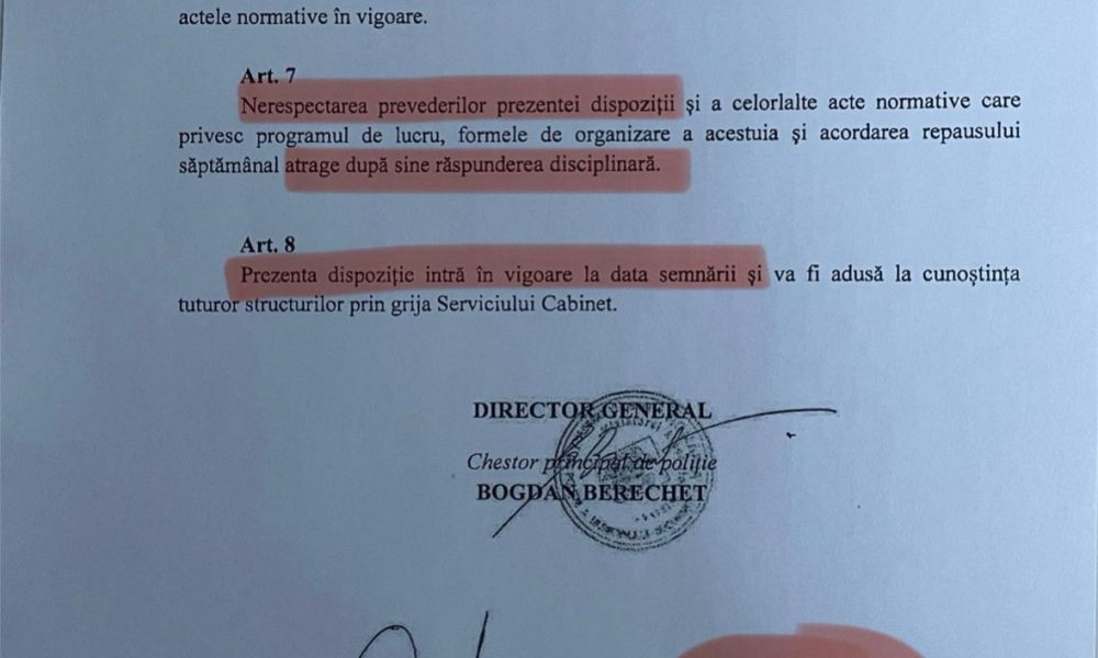 La nivelul poliției capitalei, după orele de program, Berechet a emis o dispoziție ilegală prin care se reglementează programul de lucru la nivelul structurilor de ordine...
