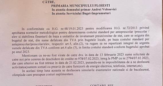 Scolile din Ploiești s-au trezit cu banii retrași din conturi, după care au primit o adresă semnată de primarul Andrei Volosevici. În document, directorilor de școli...